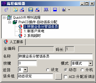 表示业务层已经根据来电的主被叫号码找到了应该接入的话务员或话务组,流程配置对应的子节点是‘人工服务节点’,属性为‘动态’,即表示由系统根据插件返回动态指定分配对象。