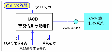 iCall智能话务分配由插件PniACD实现。PniACD通过WebService与业务系统交互。当客户来电时,PniACD插件将客户来电号码、主叫号码通过WebService接口传给业务层,业务层根据客户关系返回本次来电应该接入的话务员工号,如果未找到业务分管话务员则返回0。