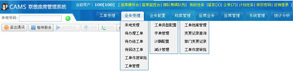 统计时间段内各操作员的坐席接听情况,如登陆时长、已接电话数、未接电话数、登记工单数等; |