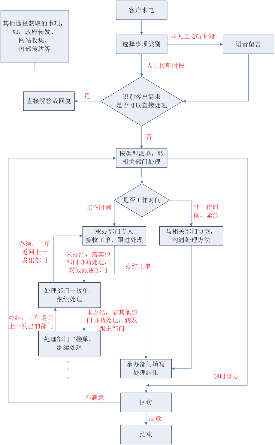说明:按类型派单,转相关部门处理环节中,可根据工单类型,实现多个部门之间的相互流转,即由系统配置的处理部门第一次接收处理,若需要其他部门协作,则选择其他的某一个部门进行派发,后续部门的处理类似。每个部门需要填写处理意见、处理事件及处理人。并且每个部门处理完后,需要根据工单的状态判断回传给其他部门。如果是未办结的,可继续转其他部门。如果工单状态是已办结,就必须转回发给本部门的上一个部门,一直返回到第一次派发的部门,由第一次派发的部门填写最终处理结果后完成工单的处理。