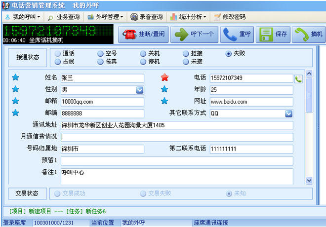 当点击呼叫或预测呼叫接通客户时,坐席电脑自动弹出显示客户详细信息和业务登记界面,方便进行业务登记。