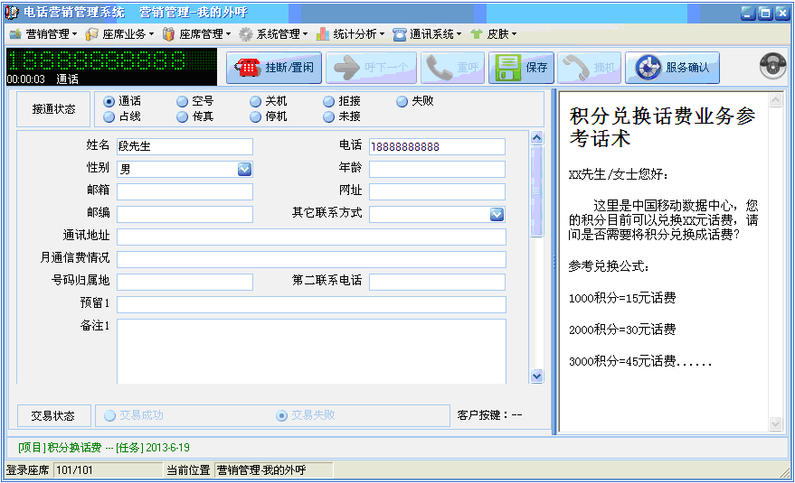 话务员在进行外呼时,可根据话术页面上的提示与客户进行交流,有效的避免因为紧张或突发情况而出现辞不达意或浪费与客户达成共识机会的情况,从而达到事半功倍的效果。