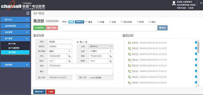 联傲电话助理TS版,支持自动外呼、预览外呼、点击外呼,支持客户跟进、客户管理、客户分配、营销阶段管理、预约外呼等,全程通话录音,并提供来电弹屏,话务统计分析等完善的功能,满足电话营销企业全流程管理的需要。