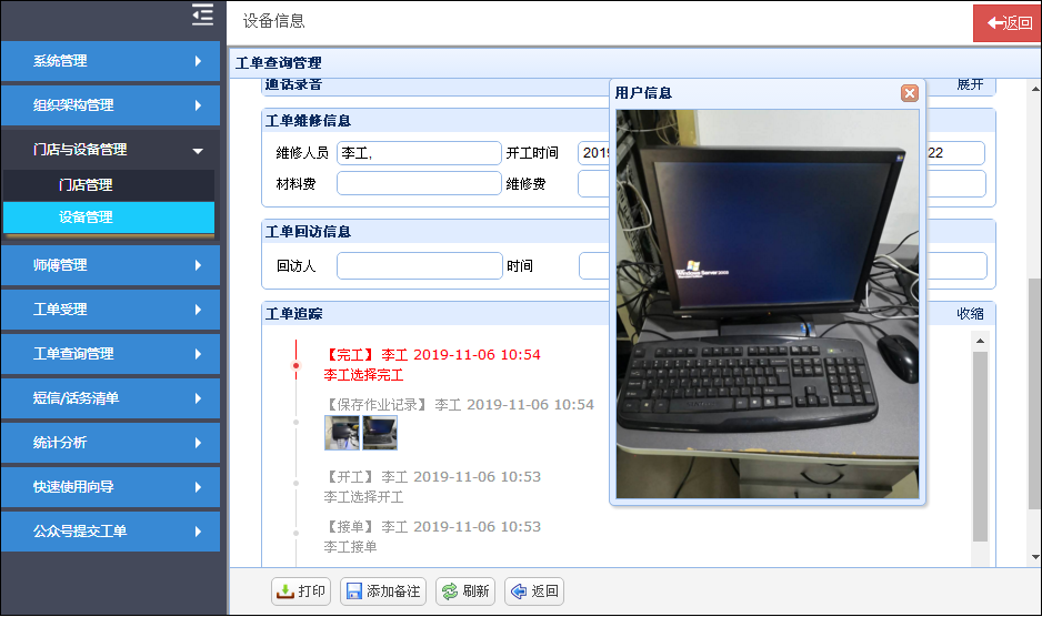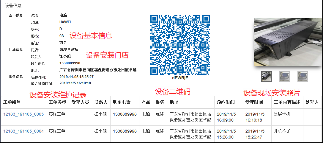 针对连锁门店分布广、数量多、设备维修难管理难的痛点,深圳联傲专门研发了“连锁门店设备维修和管理平台”,按组织架构树对门店设备进行登记管理,一物一码,每台设备一个二维码,扫码查询设备信息,有故障可一键报修;支持服务商和工程师加盟,根据门店位置和设备类别就近派单,实现最低成本快速维修;服务商或工程师通过手机接单处理登记拍照等,处理记录上传服务器,可实施跟踪,维修历史可追溯;总部管理者可随时查询各门店设备资产状况,以及每台设备的安装维修历史记录;大幅降低设备维护成本,提高设备管理水平,提成门店绩效。
