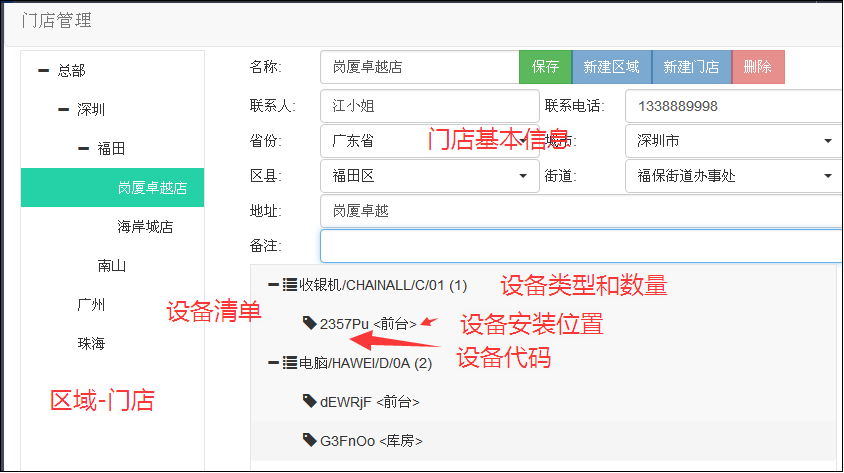 组织架构树、门店设备树:门店设备清单和数量一面了然。