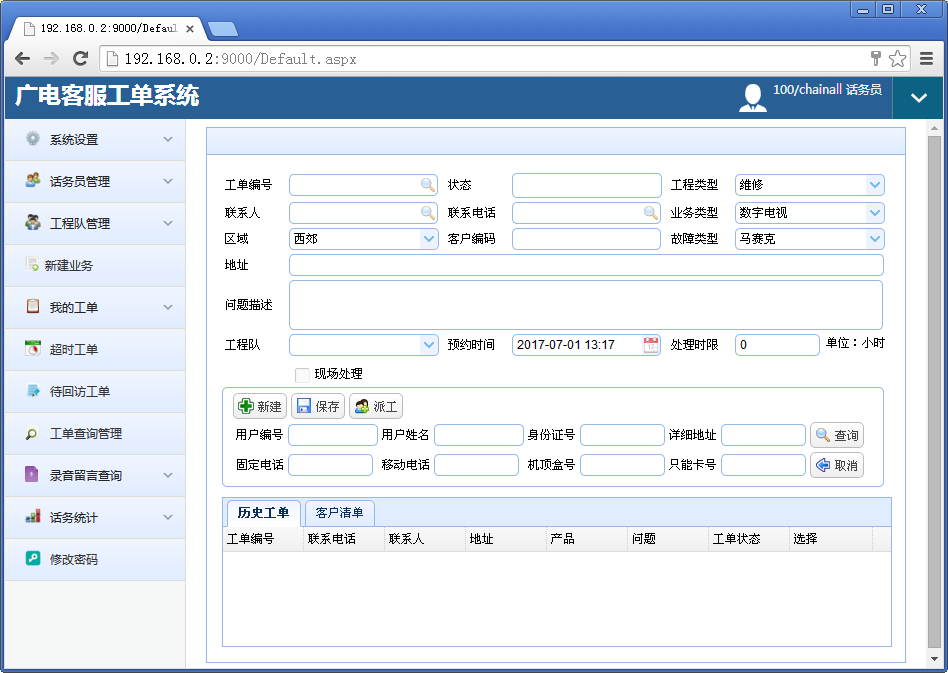 新建工单,派单,查询工单状态和处理记录等。