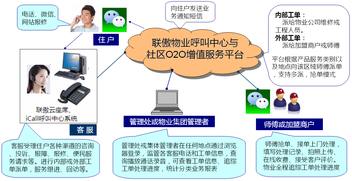 联傲物业呼叫中心与社区O2O增值服务平台(以下简称平台或系统)将物业管理的基础客服业务(咨询、投诉、报障等)与便民服务(安装、维修、开锁、消杀…)整合。系统支持电话、微信、网站多种渠道业务受理,支持商户加盟;物业基础服务派单给物业内部工程人员,便民服务派单给外部加盟商户。住户不论有任何需求,只需要联系物业就可以搞定,极大地方便了小区住户,同时也为给加盟商户带来业务,给物业公司创造了收益。