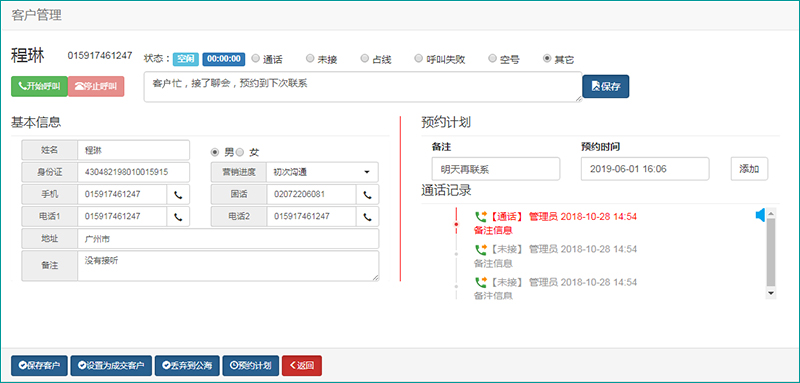 • 自动外呼:批量导入号码分配、自动外呼、通话录音、支持客户和公海管理、营销进度管理、预约计划管理等。